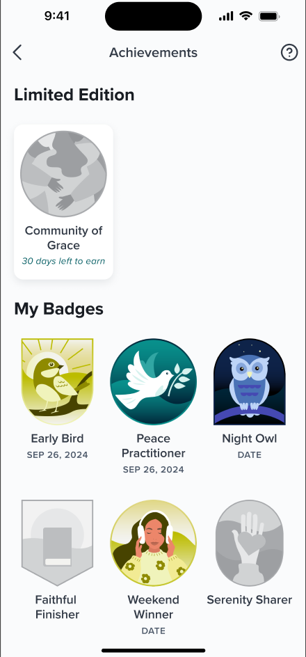 Achievements are rewards you earn in Abide for consistent listening and engagement. They appear as badges under More > Achievements (Premium only).